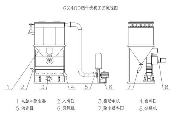 GX干洗機(jī)由清吹器、分段器、分級器、除塵器、引風(fēng)機(jī)、電控柜等幾部分組成。