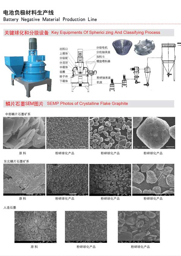 CSM-T型球化設備就可以從提高振實密度和導電性兩方面提高電池材料的物理和化學性能,進而提高電池的品質(zhì)。 制備鋰電池負極材料的基材—有特殊粒徑的土豆型球化石墨。我們公司開發(fā)研制的具有知識產(chǎn)權的成套球化石墨生產(chǎn)線,適用用于天然鱗片石墨、碳素人造石墨的生產(chǎn)和整形。